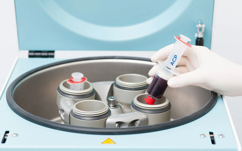 Het bloed wordt vervolgens 5 minuten gecentrifugeerd in een speciale centrifuge. Door dit proces scheiden we het plasma – dat rijk is aan groeifactoren – van de rode bloedcellen. Dit plaatjesrijke plasma (PRP) is essentieel voor het stimuleren van haargroei en huidverbetering.